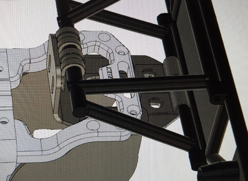 Then the bracket/bumper assembly bolts onto the Bonehead wheelie bar brackets/baja bumper brace as shown in the CAD Render to tie it all together for extreme strength via the 4x mounting holes.