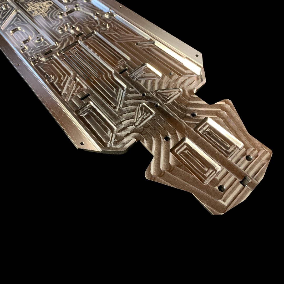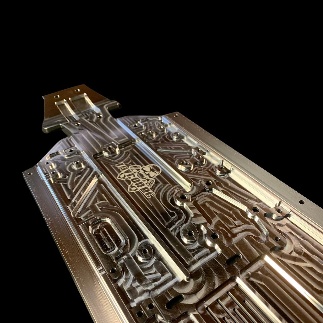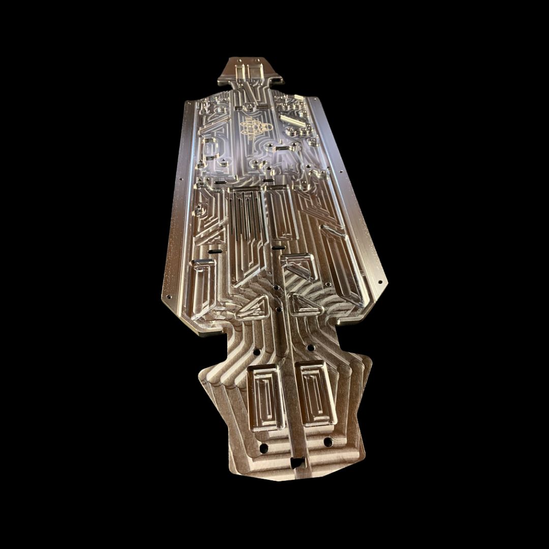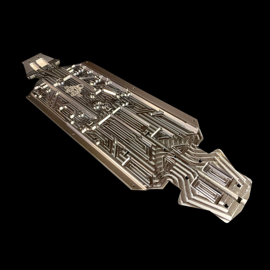 Like our Losi chassis and its inserts though, its milled from a single super thick billet with no bending or forming for the kick up or side pod support rails which allows us to get a pure material grain throughout improving strength. Also this design means that our chassis has a lovely smooth bottom to protect your diffs without need for heavy skid plates! Win Win!