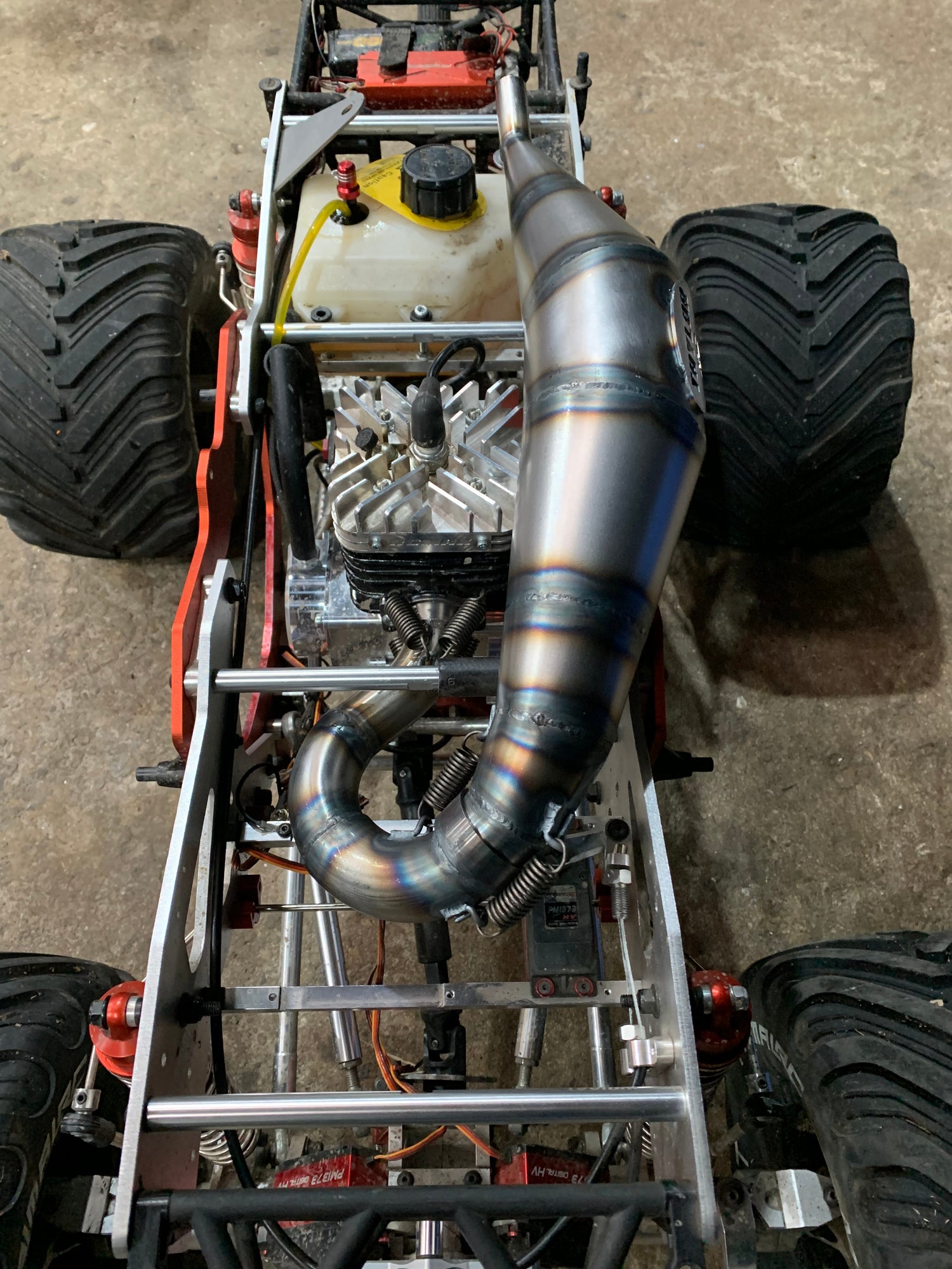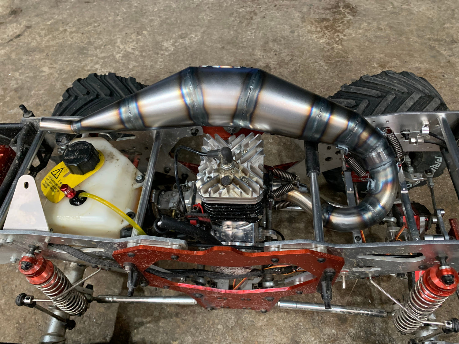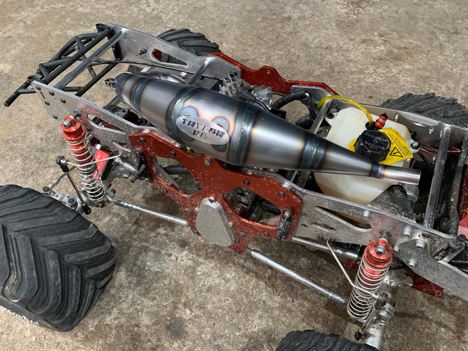 Our new insanely powerful un-silenced Big Bore exhaust pipe for the Primal 1/5 Raminator and Mega Monster Trucks! (will fit the grave digger but cage cutting is involved)