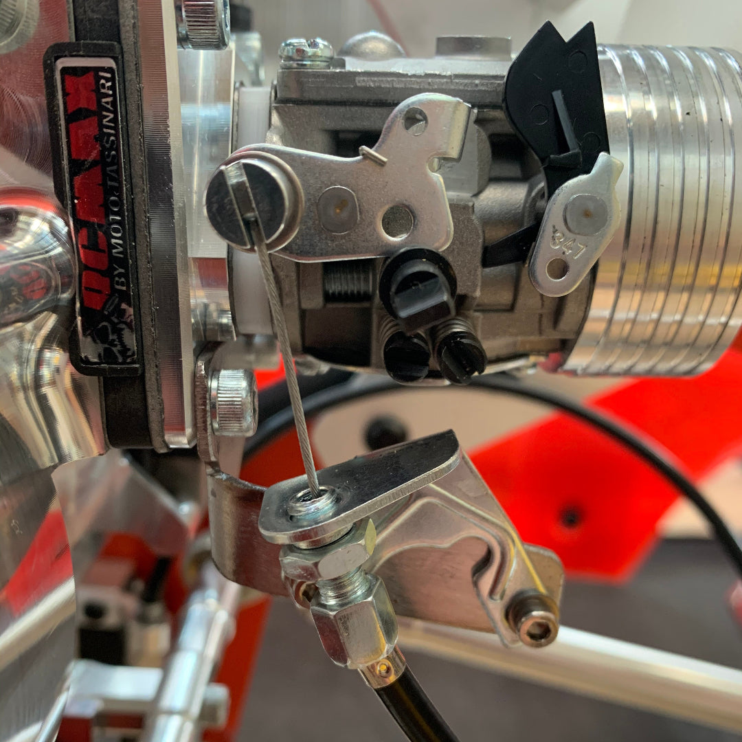 As mentioned above, if you cut your chassis it will drop in, if not, remove the pull start side chassis plate and then there is room to fit. Fit all the engine mounting bolts supplied. Next you can hook up the throttle linkage cable onto the big bore WJ71 carb. Simply remove the linkage cable hole from the stock carb by popping the bracket off and removing the E clip. Then put this piece onto the Hole cut out in the WJ71 Carb arm as shown in photos.