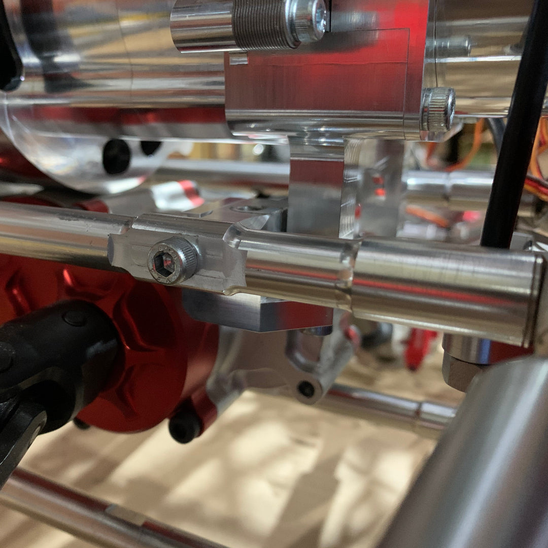 Fitment into the Primal Raminator is fairly straightforward. Once you have removed the stock engine and pipe, also remove the centre top cross over link bar between the two side chassis plates.
